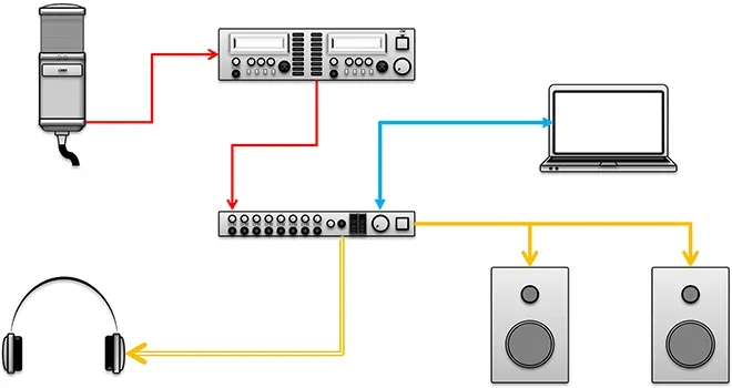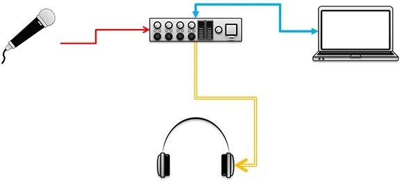 Votre micro est câblé directement sur l’entrée de votre carte son et votre voix est enregistrée sur une piste de votre DAW.