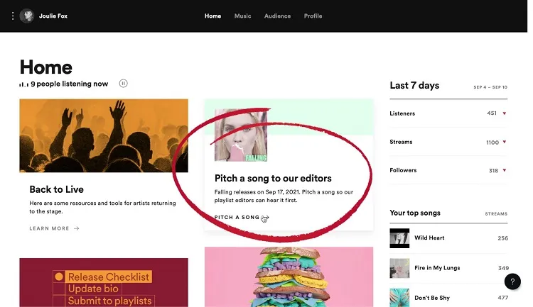 Depuis 2018, Spotify propose un outil extrêmement pratique qui permet aux artistes de soumettre leurs morceaux aux créateurs de playlist Spotify, dans l’espoir d’être sélectionnés : Pitching Tool.