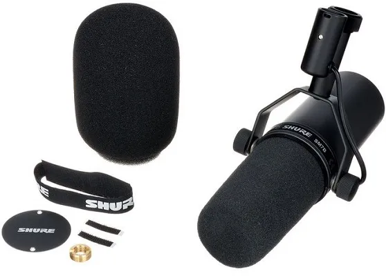 Le Shure SM7B est un micro de type dynamique largement utilisé dans les studios d’enregistrement pour la voix notamment. Concernant les équipements annexes : il est équipé d’un filtre anti-pop et anti-choc, ainsi que d’un atténuateur de graves commutable pour l’ajustement la réponse en fréquence.